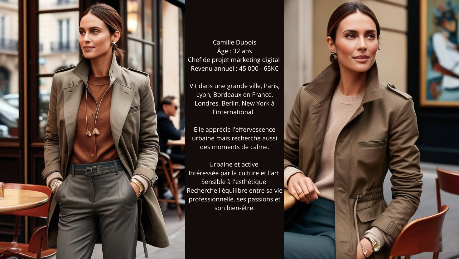 - Urbaine et active : Camille se déplace principalement à pied, à vélo ou en transports en commun. Elle a une vie sociale riche et variée, entre dîners entre amis, expositions, concerts et week-ends occasionnels à la campagne ou à l’étranger.